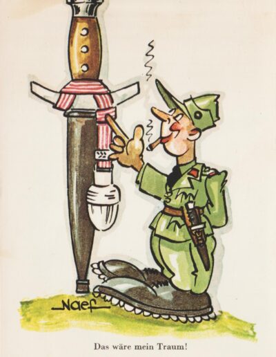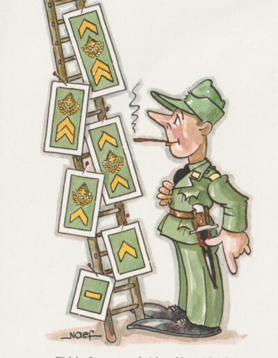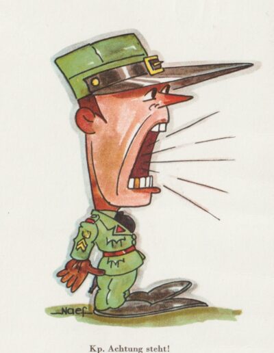 Il le rappelle : 180 cartes, ce sont 180 idées. Il affirme n’avoir jamais eu de difficulté à en trouver, puisant d’abord dans son expérience personnelle : officier du train pendant la Seconde Guerre mondiale, il compte 1’400 jours de service à son actif.(3) Ce sont ensuite ses élèves de l’école de Wattwil qui lui ont fourni la matière nécessaire. Des élèves qui, à leur tour sous l’uniforme, lui envoyaient parfois ses propres cartes, un clin d’œil qui leur valait en retour un petit paquet…