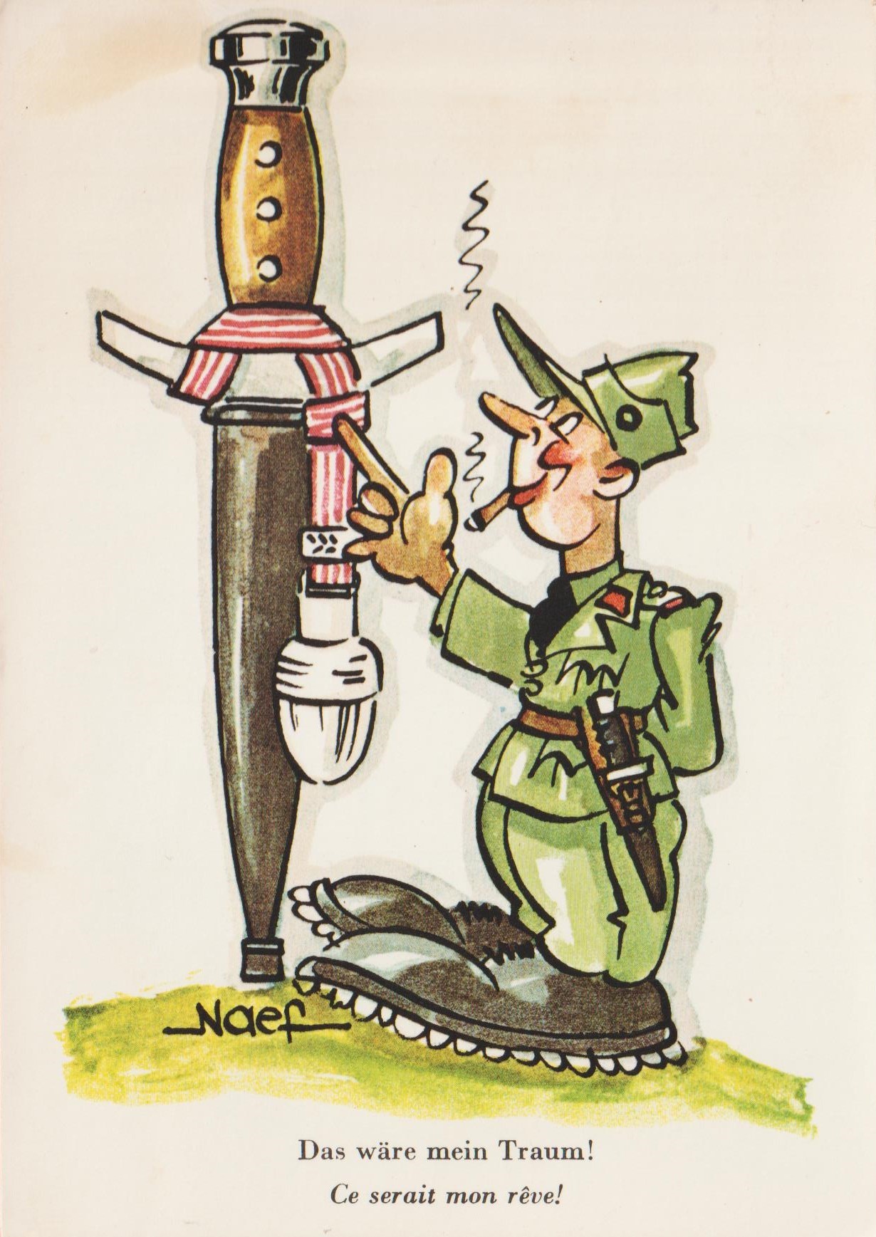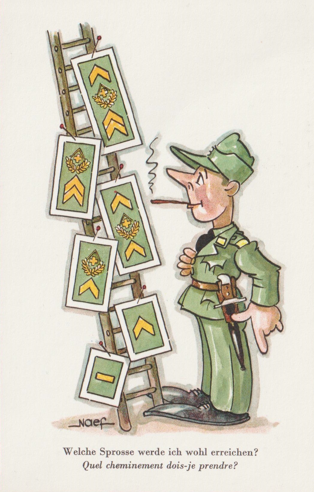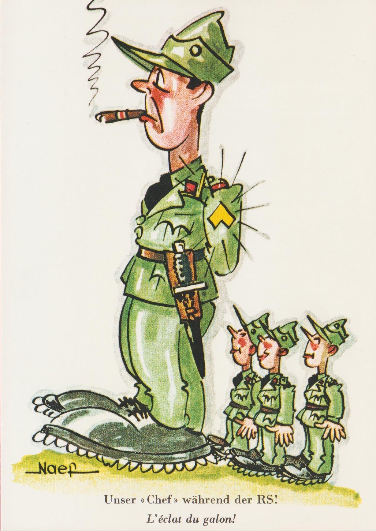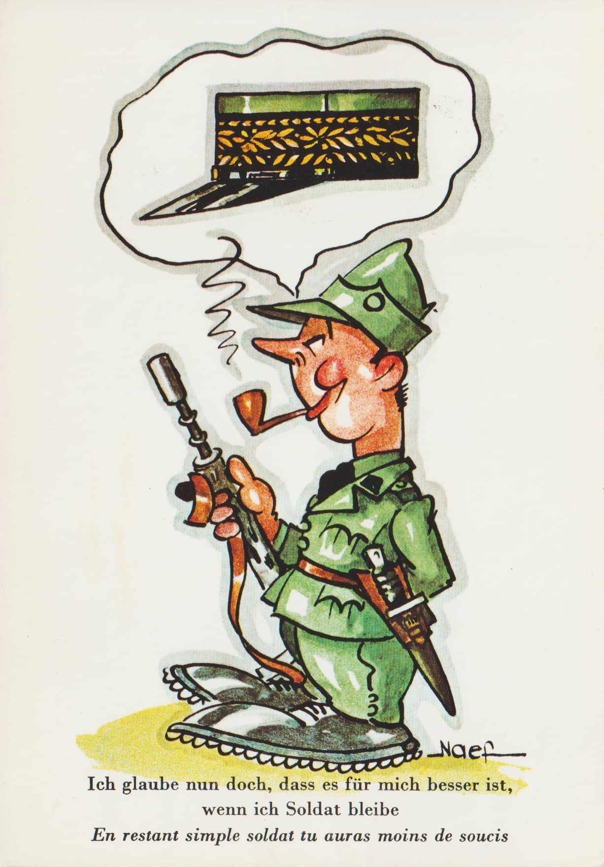 Aux journalistes qui l’interrogent à cette occasion, Milo Naef raconte qu’il s’est fait remarquer dès son école de recrue par ses camarades pour les dessins qu’il donnait au « Schweizer Eulenspiegel-Kalender » (une publication annuelle satirique, comportant des caricatures). (1) Lors de son premier cours de répétition, précédé d’une réputation naissante, il est encouragé par les officiers, notamment par le commandant de bataillon, à se lancer dans la création de cartes postales. Ce commandant lui explique en effet que, ses sujets n’étant jamais lourds ou dévalorisants contrairement à ce que l’on pouvait alors trouver dans les casernes, les officiers pourraient se permettre de les envoyer…