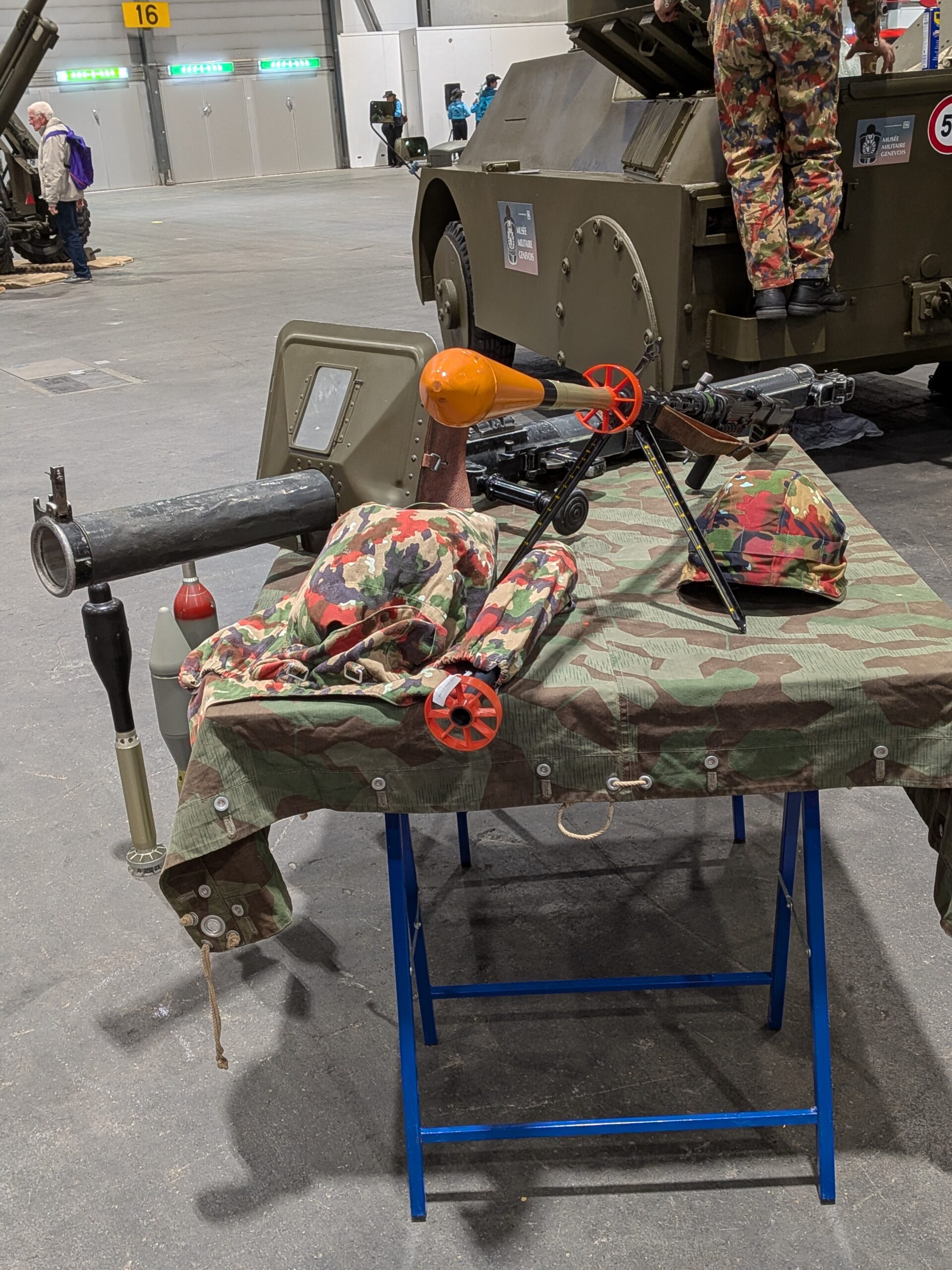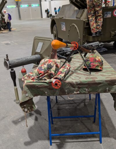 En lien avec le char attrape était projeté un film sur le combat anti-char de l’infanterie au moyen de grenades à fusil – que complétait la présentation d’un tube roquette modèle 50, d’un fusil d’assaut 57 et de plusieurs types de grenades.